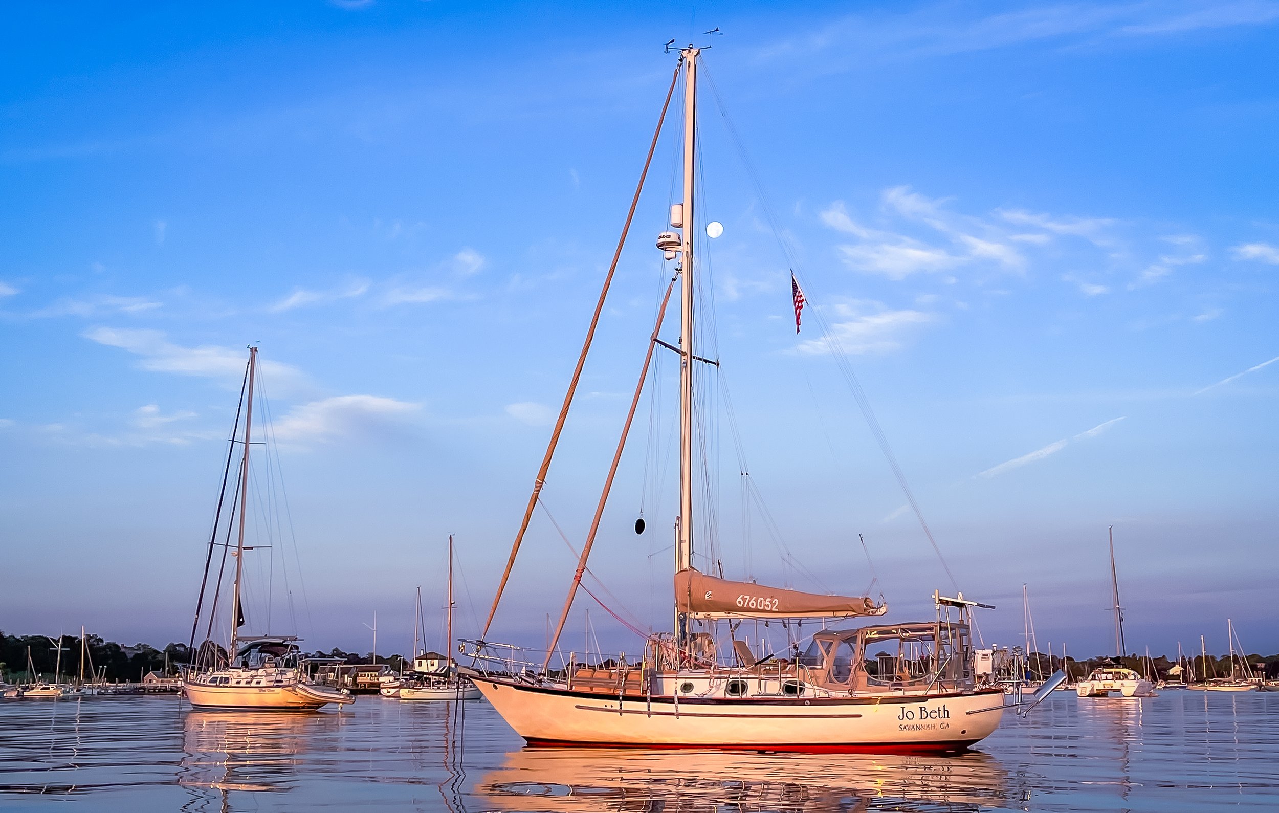 Our plan is to be sailing south by middle October, aiming for the Florida Keys. We are working to get JO BETH ready to move once again, shaking the seasons off of her along with the Maryland dust, while waking up and testing dormant systems. The heat and humidity rule much of what we do during the days. The pace of work is methodical and measured for sure.
