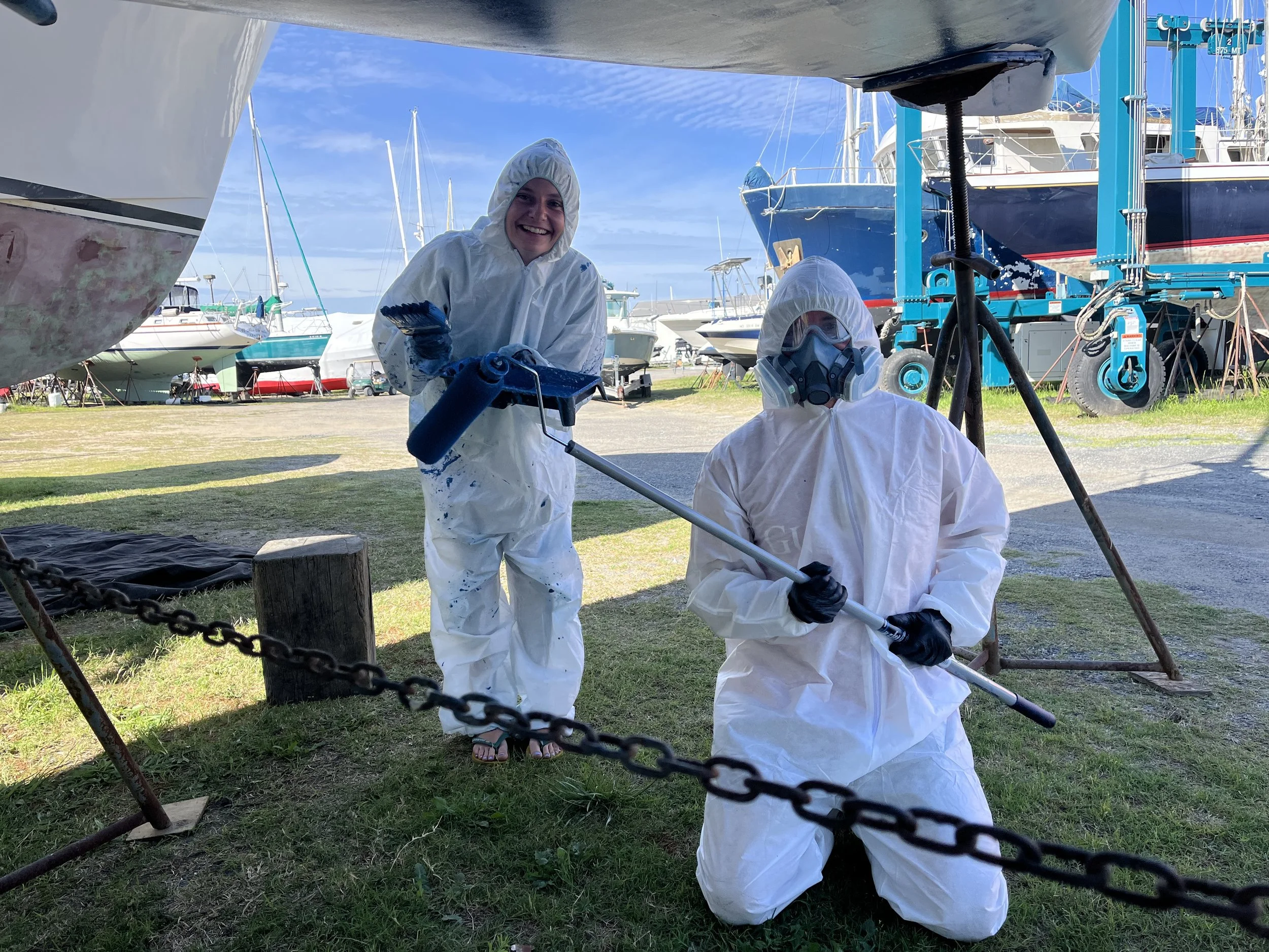 Kyle and Jana, painting the bottom of their sailboat, RUBICON…