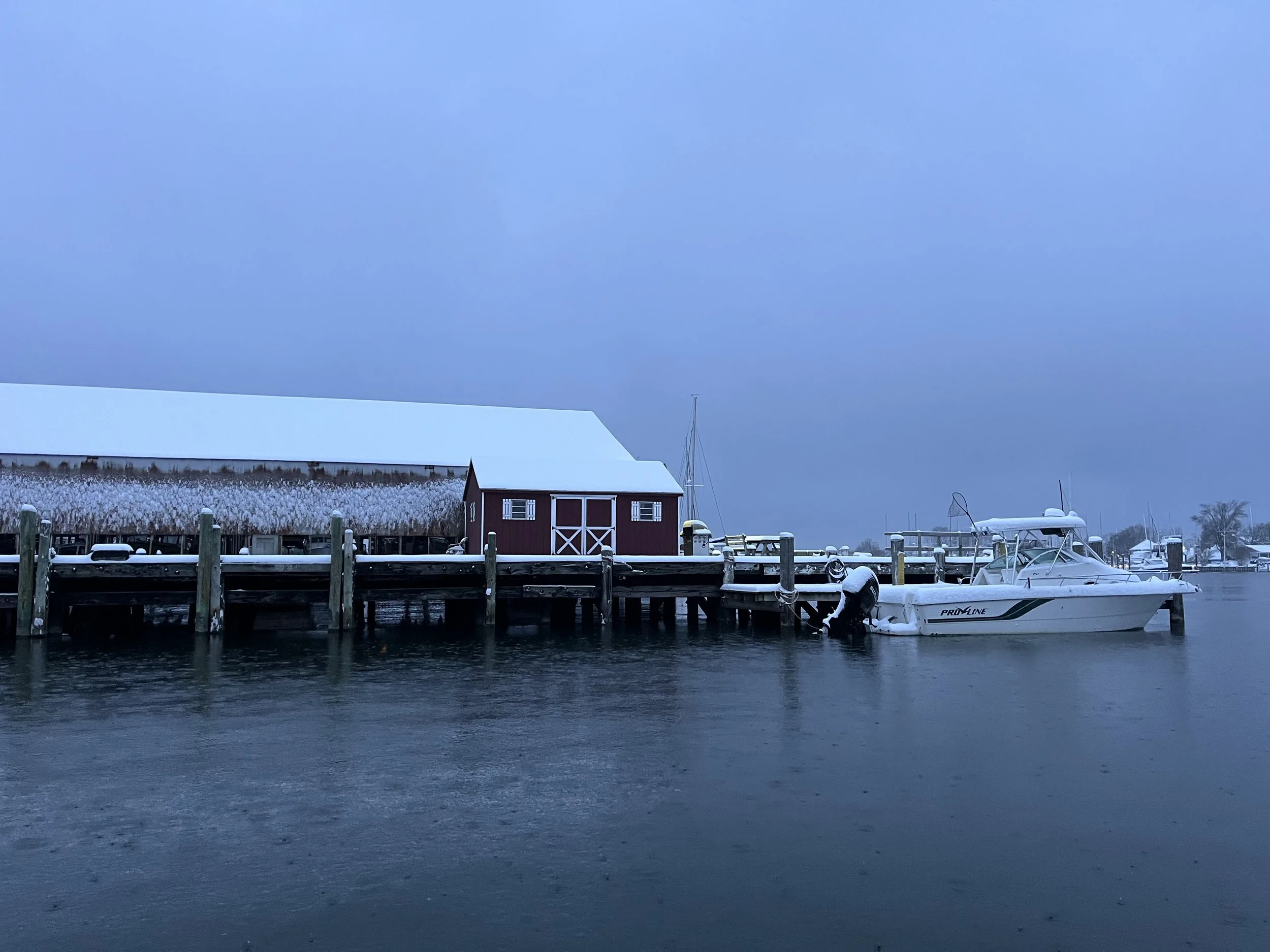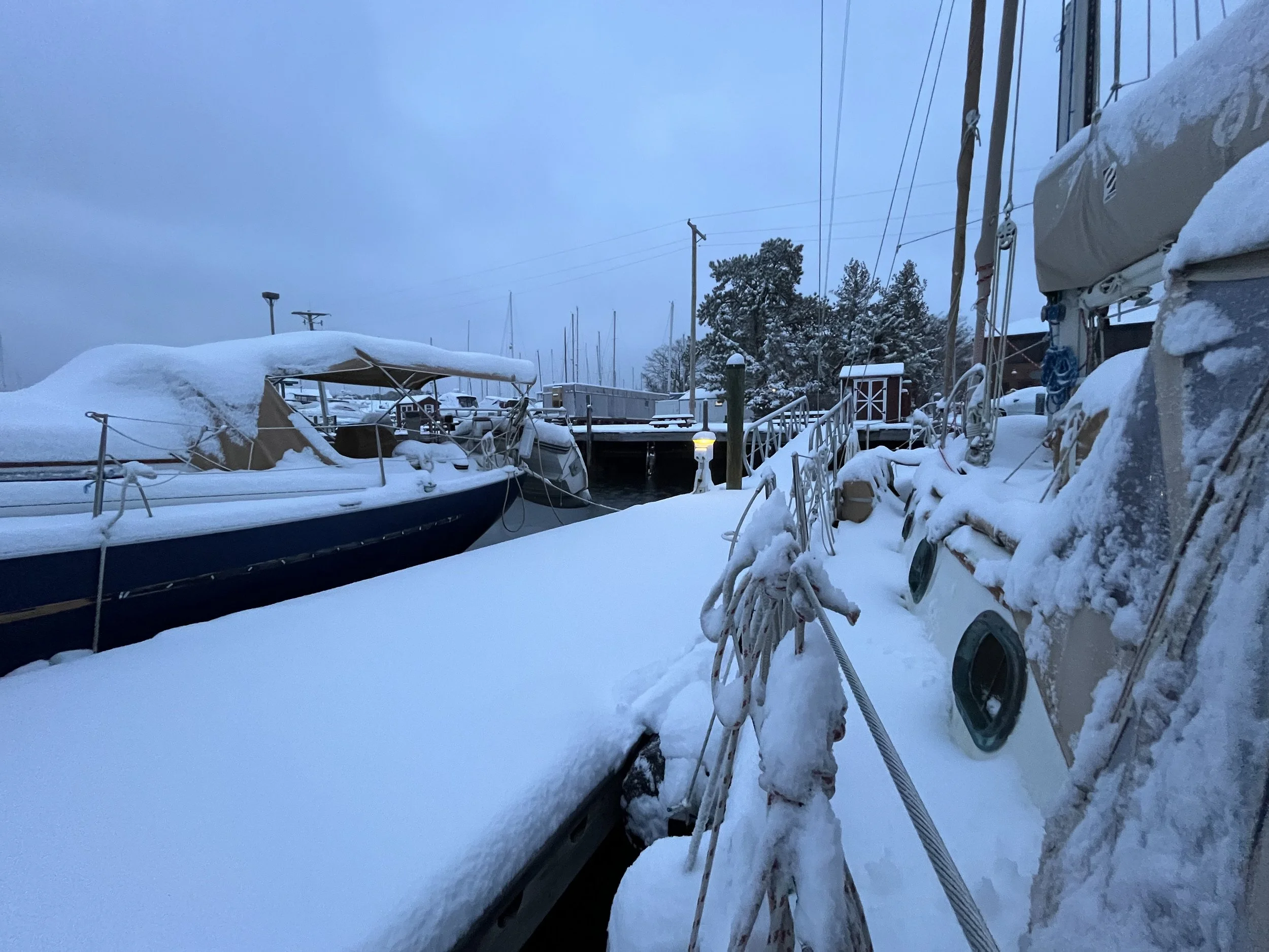 On the evening of January 5, 2025, as we ended our day, the local weather forecast predicted ‘snow flurries with accumulations expected’ beginning overnight and continuing throughout the following day, with frigid temperatures for several days afterwards. What we experienced was nothing short of astonishing. We awoke to snow accumulations in excess of four inches, with heavy snowfall continuing throughout the day. By the end of the day, there was nearly a foot of snow on the ground. The docks and JO BETH were literally buried. A week or so later, the water in the harbor basin froze over as well. On two separate instances, the boat was surrounded by a sheet of ice a few inches thick, which looked to be somewhat thicker away from the docks - people were ice skating on the creek a quarter mile away from us! North of here, Chesapeake Bay was closed for a number of days to shipping until Coast Guard icebreakers could clear the channel! There were three additional snow events, each with accumulations greater than six inches, occurring over the next several weeks. Once, in between the first two storms, we were literally frozen into the enclosure and unable to get out of the cockpit and off the boat. On a rare sunny day, the sun shown just enough on the port side of the boat during the afternoon to melt some of the snow on top of the cockpit canvas so that water ran down onto the zippers of the enclosure door and window panels. At night, the water quickly refroze and locked the zippers in place! We had to wait until the ice had thawed enough the next morning for us to break it off from the inside.